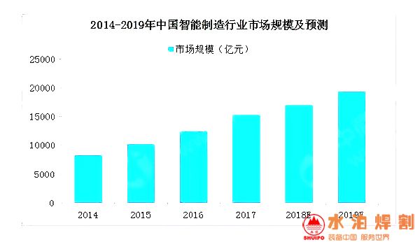 在國家政策推動,制造業(yè)技術轉型升級等背景下,中國智能制造產(chǎn)業(yè)發(fā)展迅速,對產(chǎn)業(yè)發(fā)展和分工格局帶來深刻影響。數(shù)據(jù)顯示,2017年中國智能制造行業(yè)市場規(guī)模為15150億元,增長率為22.6%,伴隨著技術的逐漸完善,應用產(chǎn)業(yè)的不斷拓展,市場規(guī)模將持續(xù)增長,預計2019年市場規(guī)模將超19000億元。