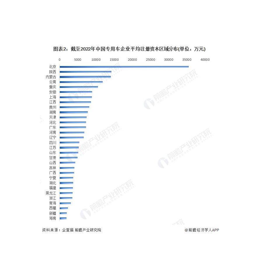 根據(jù)中國(guó)企業(yè)數(shù)據(jù)庫(kù)企查貓,目前中國(guó)專用車企業(yè)的平均注冊(cè)資本區(qū)域分布中,北京企業(yè)的平均注冊(cè)資本最高,達(dá)到 35468 萬(wàn)元。