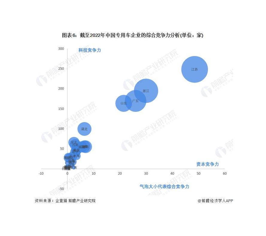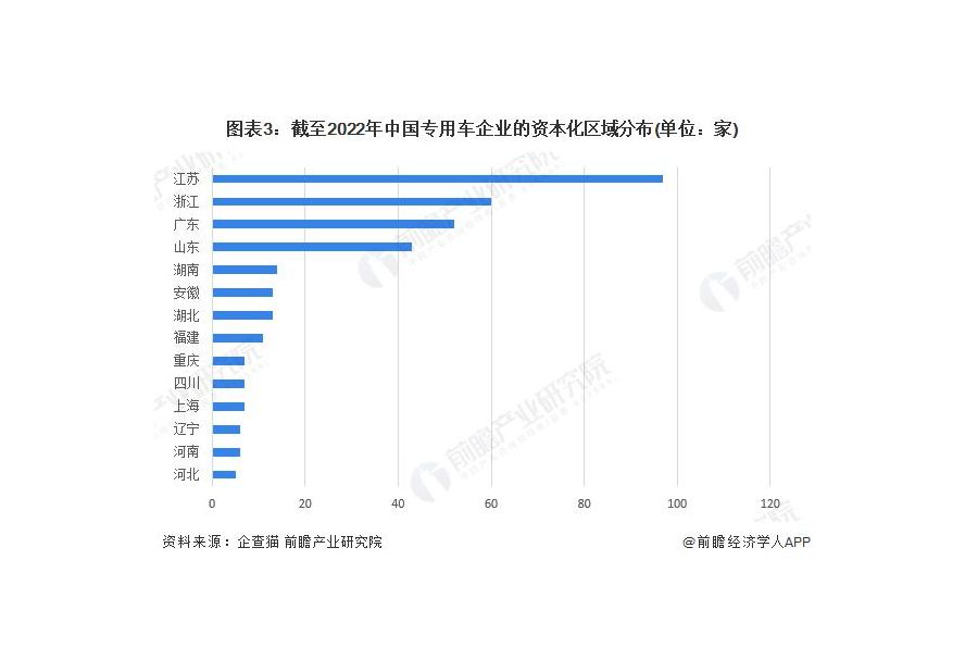 根據(jù)中國(guó)企業(yè)數(shù)據(jù)庫(kù)企查貓,目前中國(guó)專用車資本化的企業(yè) ( 有融資信息和上市信息 ) 的主要分布在江蘇。截至目前,江蘇省共有存續(xù)和在業(yè)的資本化企業(yè)共計(jì) 97 家,其次為浙江的 60 家。