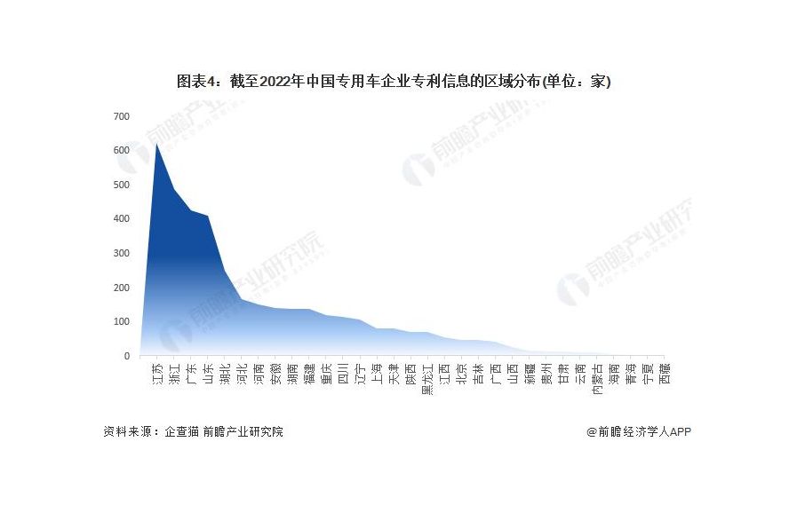 根據(jù)中國(guó)企業(yè)數(shù)據(jù)庫(kù)企查貓,目前中國(guó)專用車有相關(guān)專利信息的企業(yè)主要分布在江蘇和浙江等地。截至目前,江蘇省共有 621 家企業(yè)擁有專利相關(guān)信息,而浙江則有 487 家企業(yè)擁有專利相關(guān)信息。