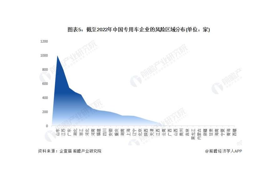 根據(jù)中國(guó)企業(yè)數(shù)據(jù)庫(kù)企查貓,目前中國(guó)專用車有相關(guān)風(fēng)險(xiǎn)信息的企業(yè)主要分布在山東省和江蘇省等地。截至目前,江蘇省共有 1001 家企業(yè)涉及風(fēng)險(xiǎn)相關(guān)信息,而江蘇則有 799 家企業(yè)涉及風(fēng)險(xiǎn)相關(guān)信息。